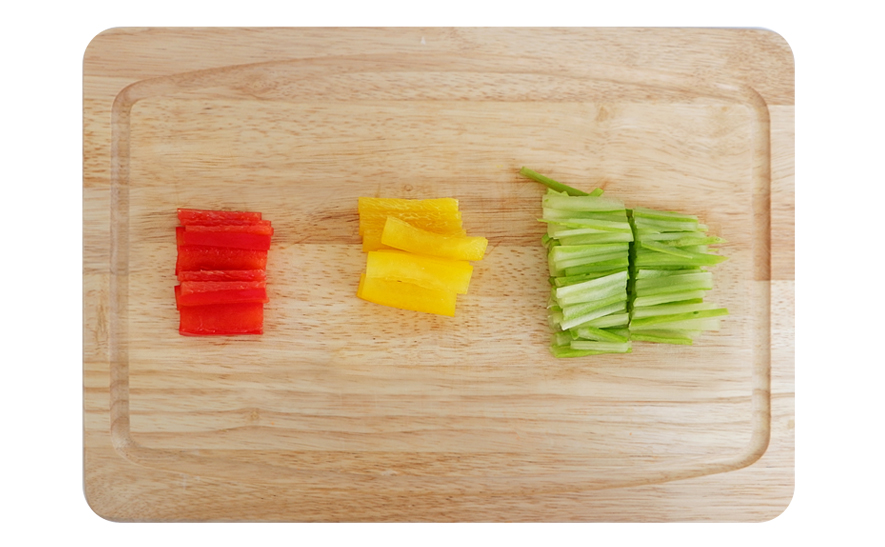빨간·노란 파프리카와 오이는 3cm 정도의 길이로 썰어주세요.